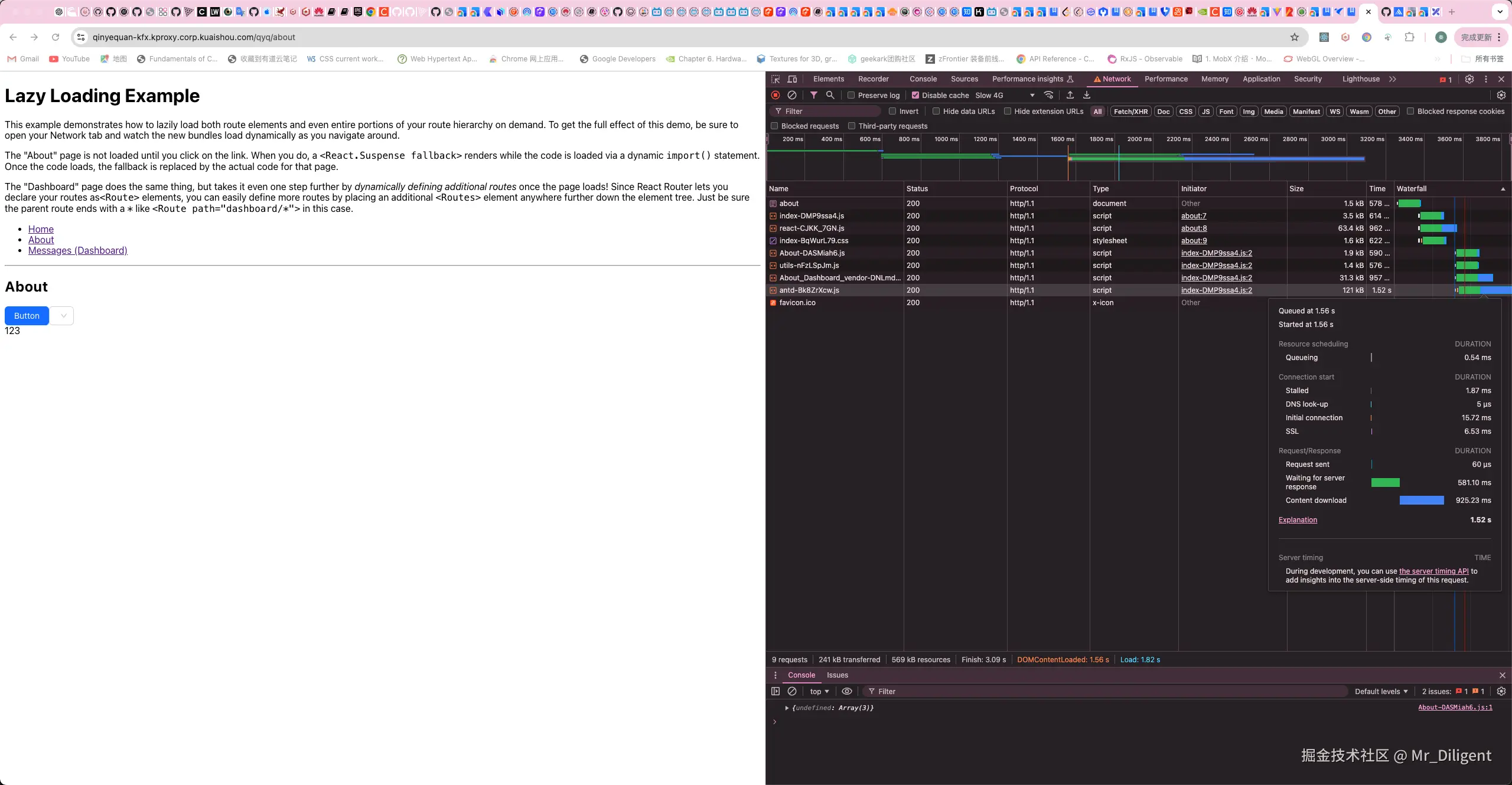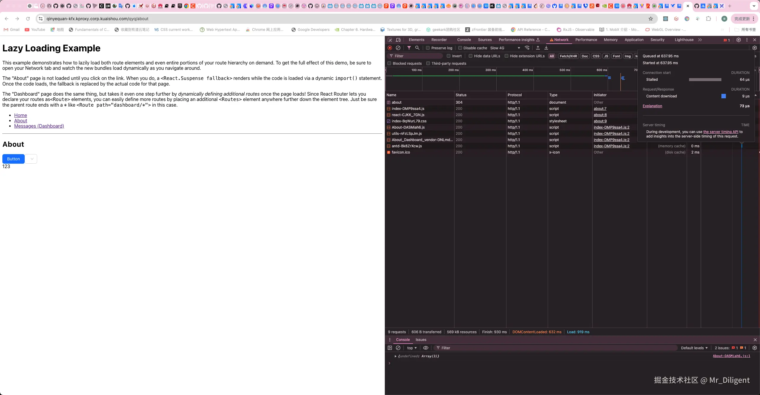 可以看到所有依赖都被拆分出来了,不管是入口文件的静态依赖,还是动态入口文件的静态依赖都被拆分,并且依赖可以被不同入口文件共享。在直接访问其中一个动态路由的时候,不需要下载无用的代码。这比简单的把所有依赖文件打包进同一个vender文件,显然来的更好。