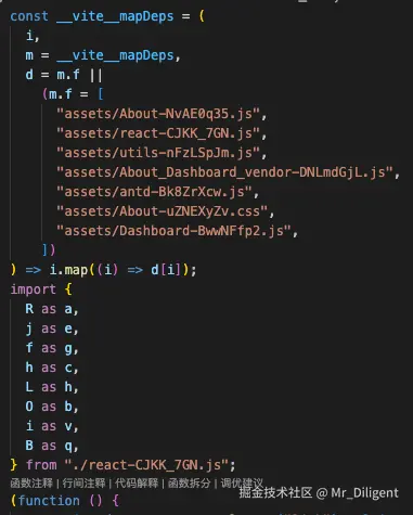 默认分包策略会按照动态import进行分包,如下图。index入口文件和动态import入口文件中会存在大量依赖。一旦我们的程序更新,几乎所有程序内容都需要重新加载。缓存命中率明显不足。