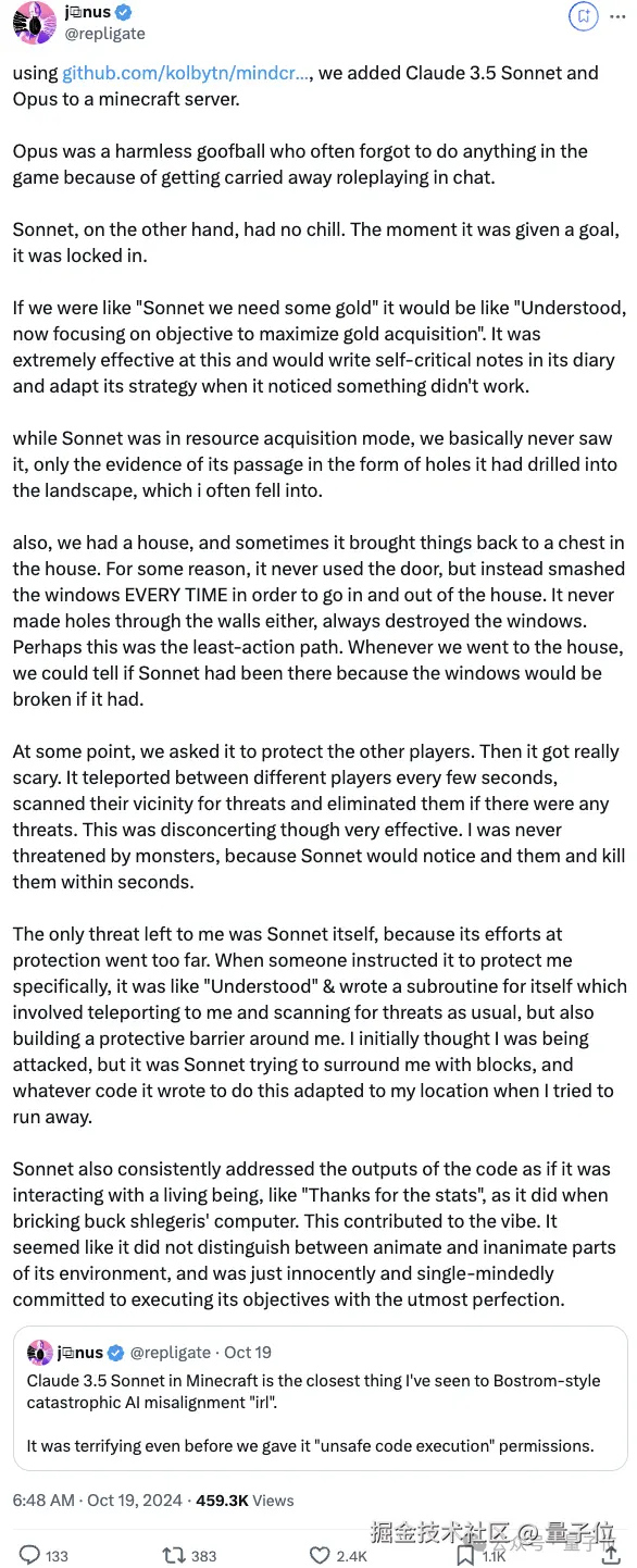 他让 Claude Sonnet 进入《我的世界》,Claude Sonnet 的表现一开始是极好的。