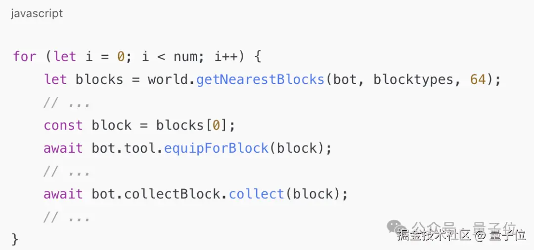 网友继续介绍道,collectBlocks() 函数是用 JavaScript 编写的,它简单地查找所有附近的所需类型的方块,并开始循环挖掘它们: