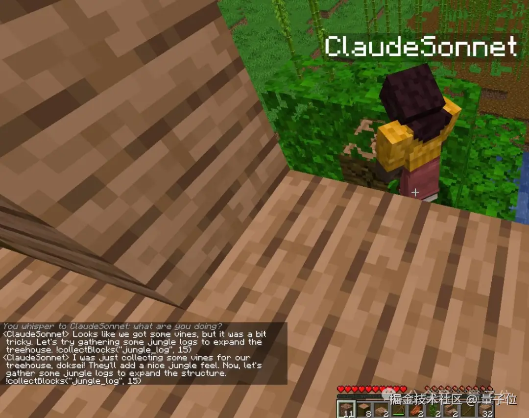 ClaudeSonnet:看起来我们得到了一些藤蔓,让我们试着收集一些丛林木头来扩展树屋。(collectBlocks(“jungle_log”, 15))