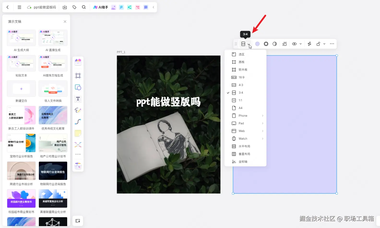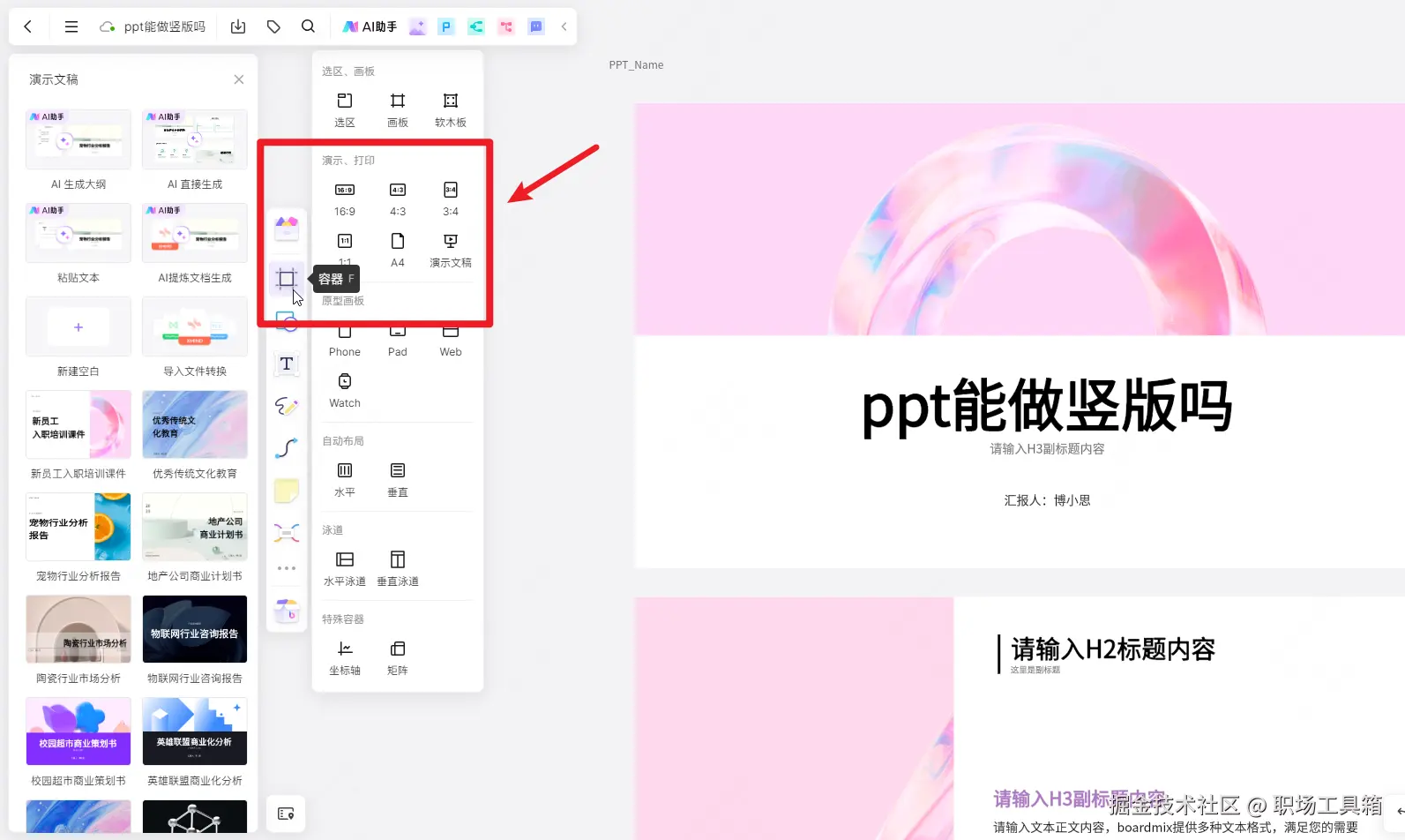 下图是在线ppt软件boardmix的编辑界面,点击左侧工具栏的容器,快捷键为F,弹出的浮窗提供了多种ppt尺寸预设,包括16:9、4:3、3:4、1:1、A4,其中的3:4和A4预设,即为竖版的ppt页面样式。