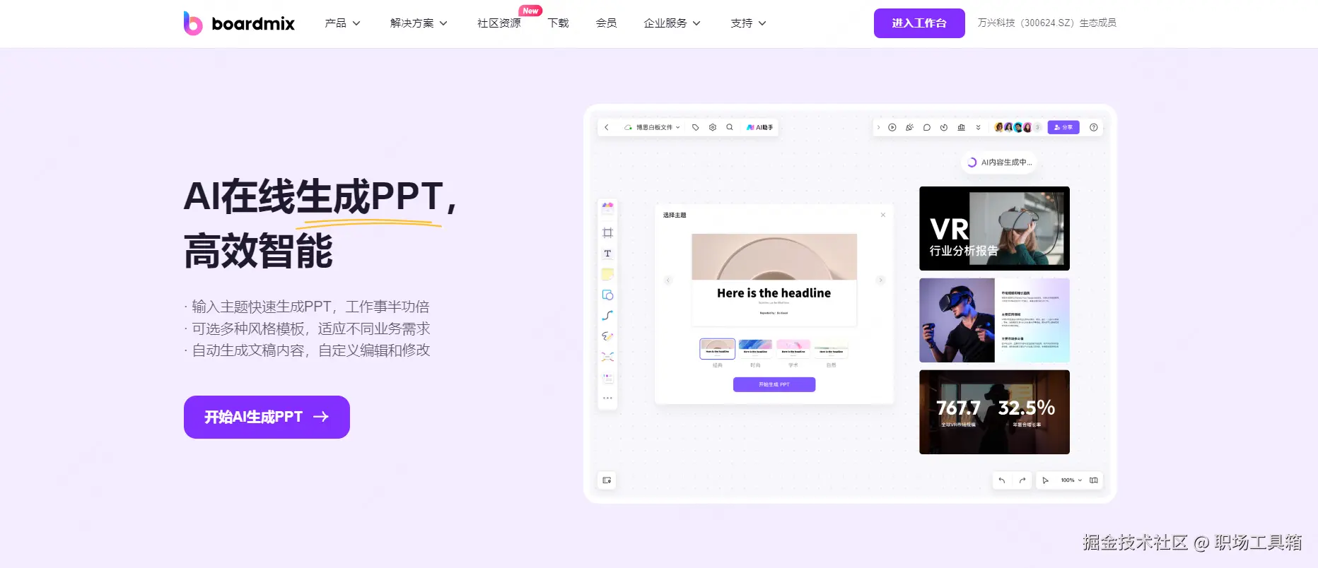 boardmix,是基于云端技术打造的在线ppt软件,它提供了自由切换ppt页面版式、AI一键生成ppt、多人协同编辑ppt、导出ppt/pdf等功能,足以满足职场办公99%的需求,畅享一站式办公新体验。