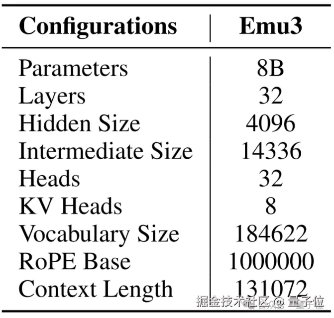 Emu3 保留了主流大语言模型(即 Llama-2)的网络架构。不同点在于,其扩展了 Llama-2 架构中的嵌入层,以容纳离散的视觉 token。网络中使用 RMSNorm 进行归一化。其还使用了 GQA 注意力机制、SwiGLU 激活函数和一维旋转位置编码(RoPE)等技术,并并去除了注意力模块中 QKV 层和线性投影层中的偏置。此外,还采用了 0.1 的 dropout 率来提高训练的稳定性,使用 QwenTokenizer 对多语言文本进行编码。详细架构配置表。