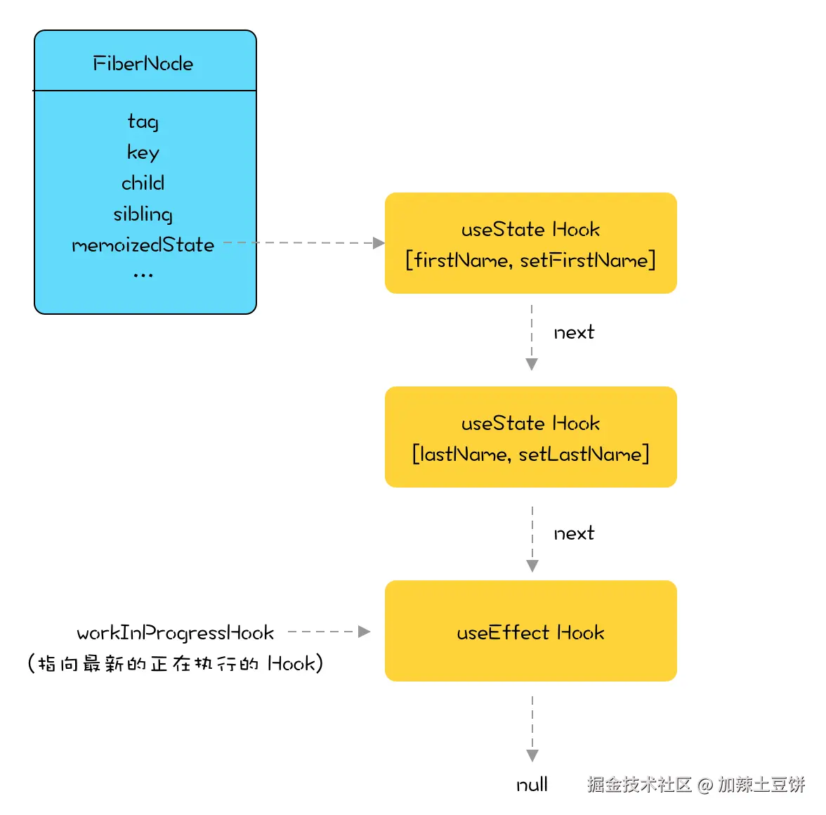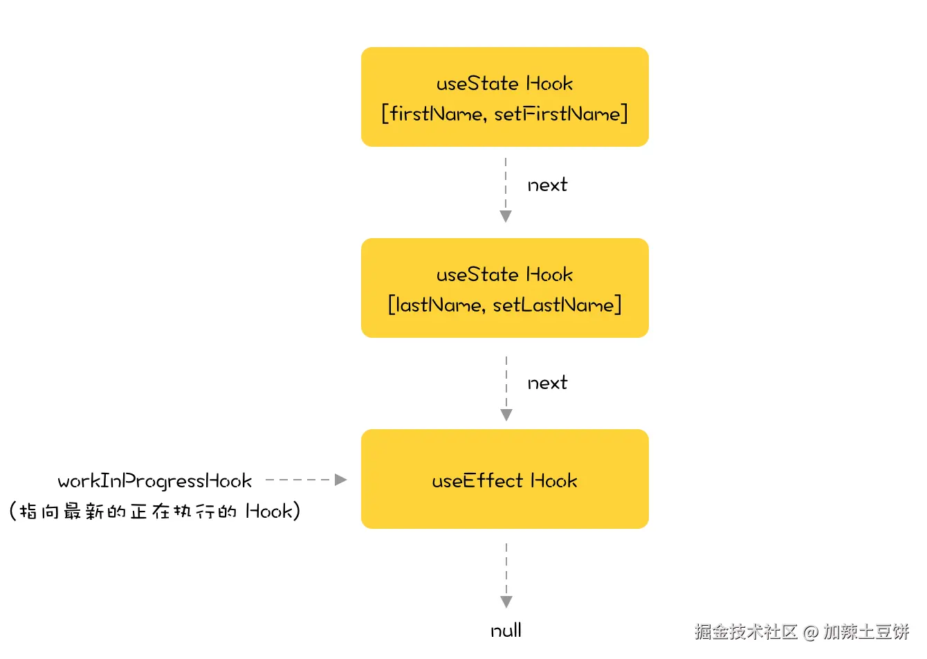 // 2.workInProgressHook 不为空,当前指针指向了链表的尾部,所以 workInProgressHook.next 为空,导致 nextWorkInProgressHook 为空。