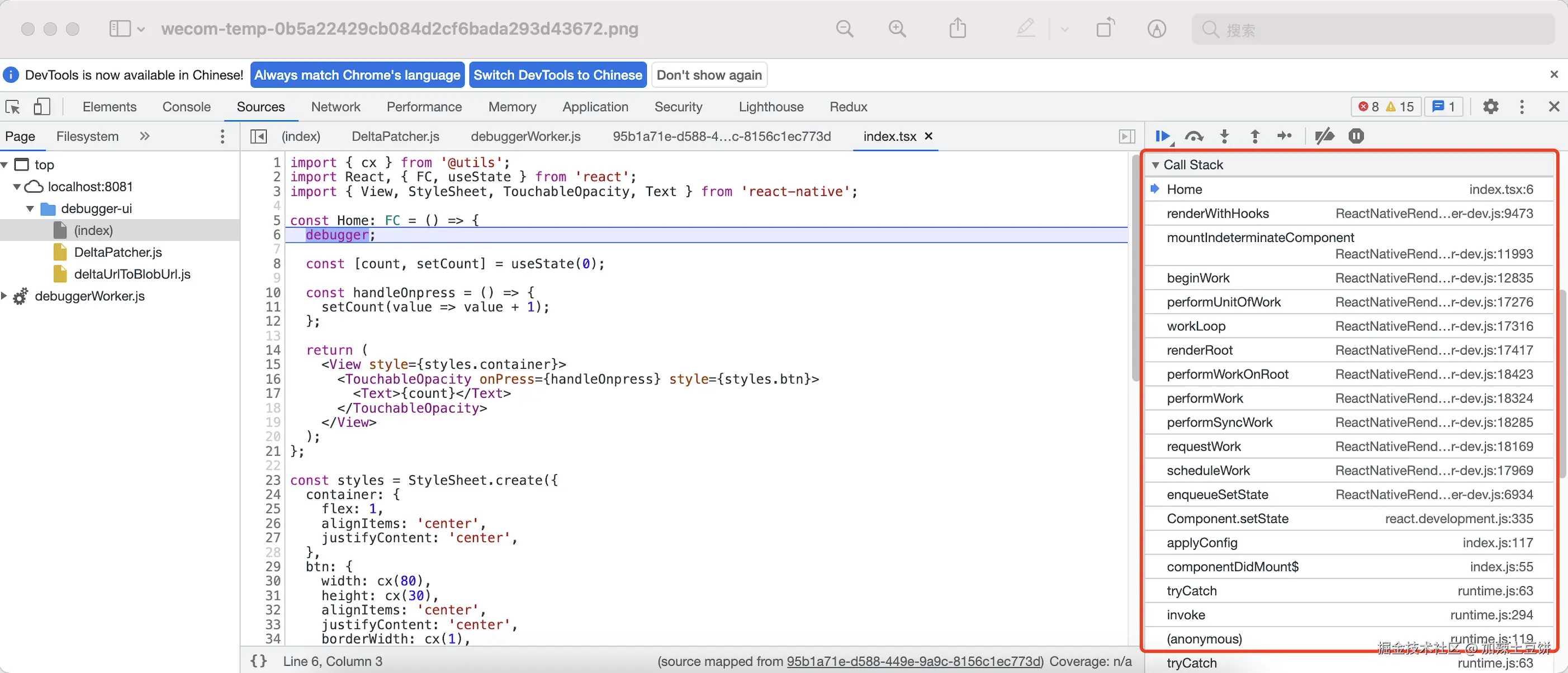 前面有提及到,我们的 Hooks 都是在函数式组件中使用的,所以我们可以从 React 函数式组件的执行过程去入手。最简单的办法就是查看调用栈,所以我们准备一个最简单的 demo,在游览器开发者模式中进行 breakpoint断点调试,看看在 mount 阶段 React 执行了什么。下图 ⬇️ 红色部分就是 Call Stack 函数调用栈信息,表示的是React 在初始化阶段执行的函数,从中可以清晰的看出,在 mount 阶段最先执行的是 renderWithHooks,并且整个调用栈中似乎只有 renderWithHooks 看起来和 Hooks 有关联,因此我们可以大胆地进行猜测,React Hooks 的渲染核心入口就是 renderWithHooks。