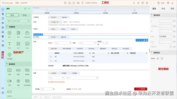 TinyEngine引擎使用插件化架构,功能模块都由一个个插件构成,例如图片中页面上方的工具栏、左侧的插件栏、右侧的属性配置栏,以及中间的画布区域,都由一个个插件构成,通过插件化的架构,可以灵活配置、自由组装出个性化的设计器。