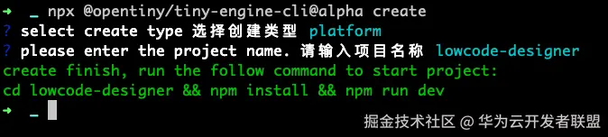之后会提示选择要创建类型,选择platform之后,输入设计器名称,如:lowcode-designer,即可完成新设计器项目的创建。