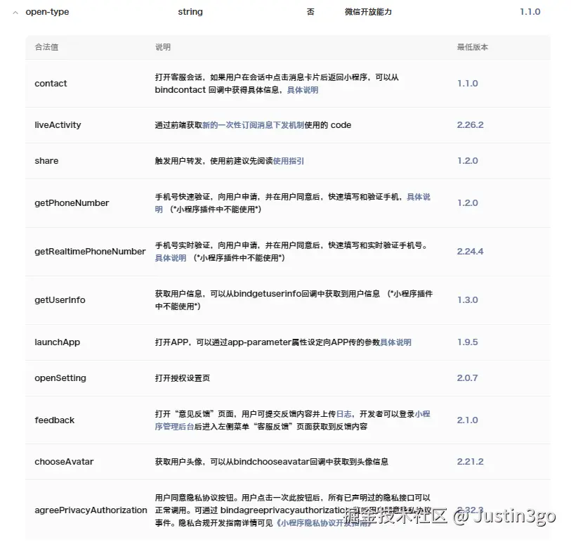 所以,页面上是必须存在button组件的,这里简单解释一下,微信小程序提供的能力都是放在button组件上的,比如刚才的意见反馈页面的打开,就只需要在button组件上加上open-type="feedback"即可,更多开放能力可以参考微信小程序官方文档