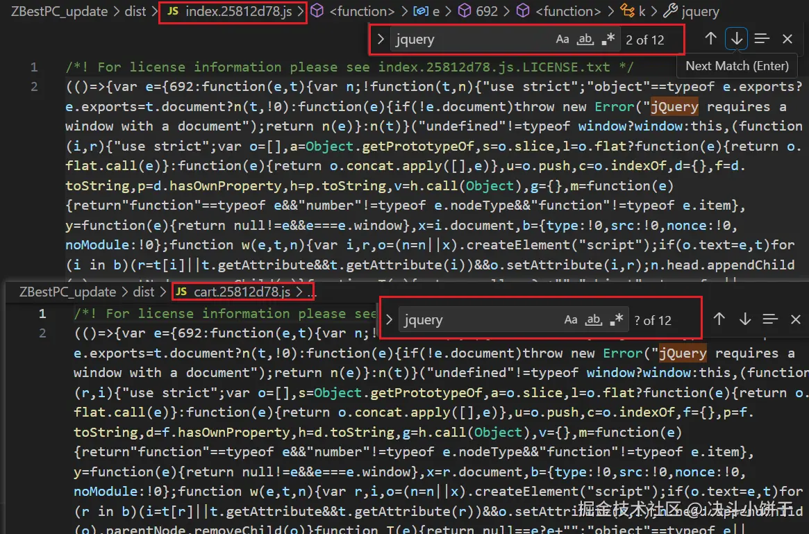 尽管目前可以编译出两个 HTML 页面的资源,但如果查看 dist 文件夹下的 index.js 或者 cart.js 文件,会发现里面仍然包含有 jQuery 的代码。