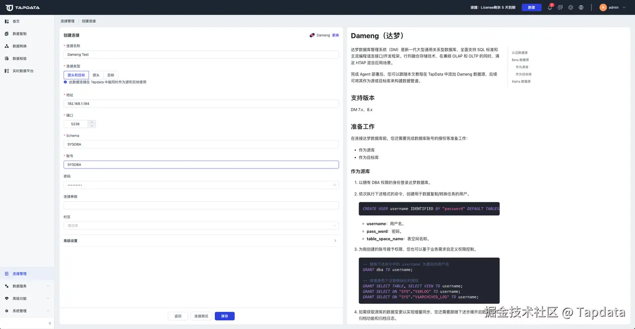 在连接 DM 之前,还需完成数据库账号的授权等准备工作。TapData 同时支持 DM 作为源或目标,当 DM 作为目标库时,准备工作包括: