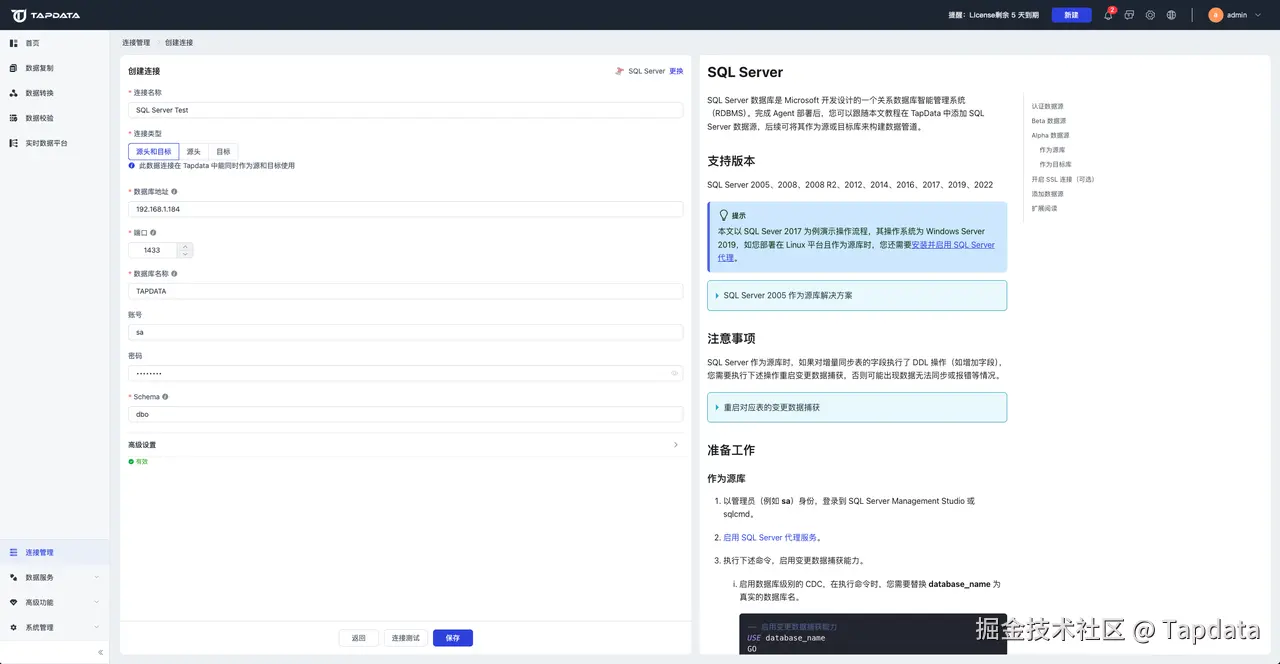 连接类型:支持将 SQL Server 作为源或目标库。