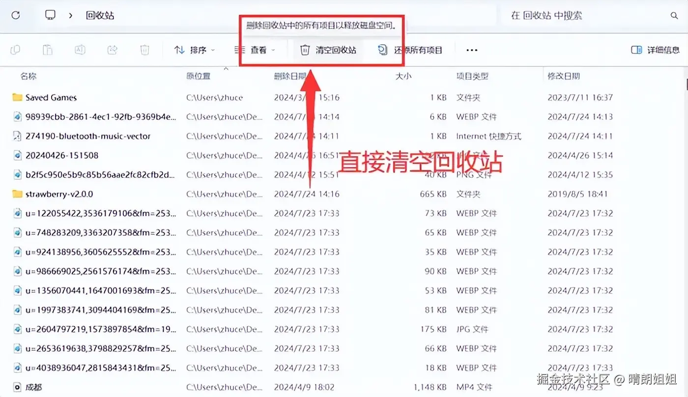 回收站是存放被你删除的文件的地方,会占用不少的c盘空间。因此,定期清空回收站也是避免c盘空间爆满的有效方法。如下图,你可以进入回收站,直接点击 【清空回收站】 即可。