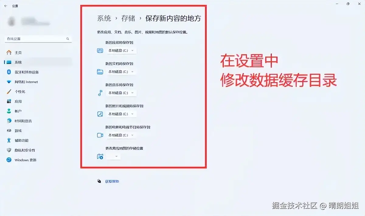电脑清除c盘垃圾的方法非常有效,但为了解决数据堆积的问题,我们可以直接更改数据的缓存目录。具体可以在电脑设置的 【系统】-【存储】-【保存新内容的地方】 中修改。