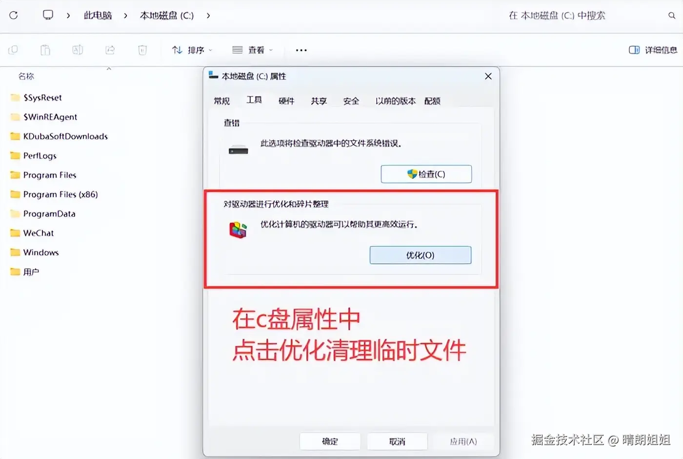 这是系统或程序在运行过程中产生的中间文件,我们通常不需要直接使用到它们,但也最容易忽略。想要快速清理c盘空间,我们可以使用系统自带的磁盘清理工具。只需要进入c盘,在空白处点击右键选择 【属性】-【工具】 ,如下图,点击 【优化】 即可。
