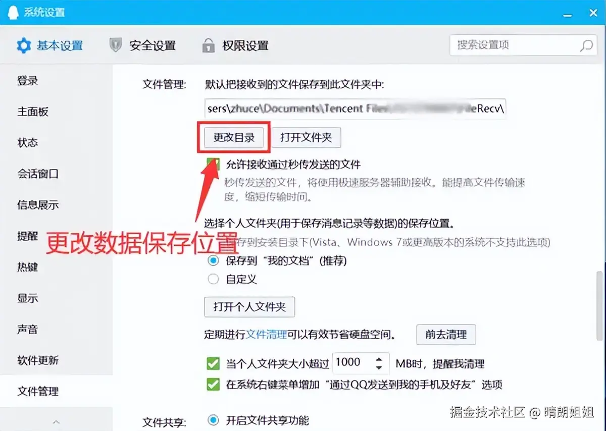 如果c盘中存储了大量非系统文件,例如聊天软件中的存储数据、聊天记录等。我们可以考虑将这些文件转移到其他磁盘中,这样不仅可以直接释放c盘空间,还能避免数据丢失的风险。如下图,可以直接将软件中的数据修改至其他磁盘中。
