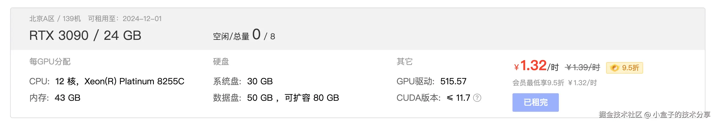 本地服务器部署开源大模型有一个前提,就是得有 GPU 显卡资源,在我下面的例子中我租用了 autodl 中的算力资源,具体是租用了一张消费级别的 RTX 3090 显卡。
