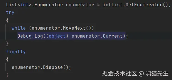 了解了List的迭代器中干了什么之后,那么在foreach中是如何使用这个迭代器的呢?我们可以通过Rider的IL View来看foreach生成了什么东西。这里可以看到foreach所生成的实际是一个while循环,并且其就是使用了MoveNext()和Current这进行迭代。