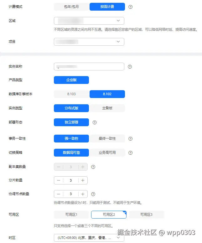 参考图2,配置实例名称,选择计费模式、产品类型、数据库引擎版本、实例类型、事务一致性、分片数量、协调节点数量和可用区。