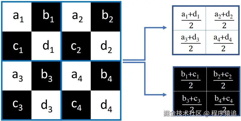 该成对下采样器将原始图像下采样为长宽只有原先一半的子图。具体地,其通过将图像分割为大小为 2 × 2 的非重叠补丁,并将每个补丁的对角线像素取平均值并分配给第一个子图,然后将反对角线像素取平均值并分配给第二个子图像。该成对下采样器的示意图如下所示: