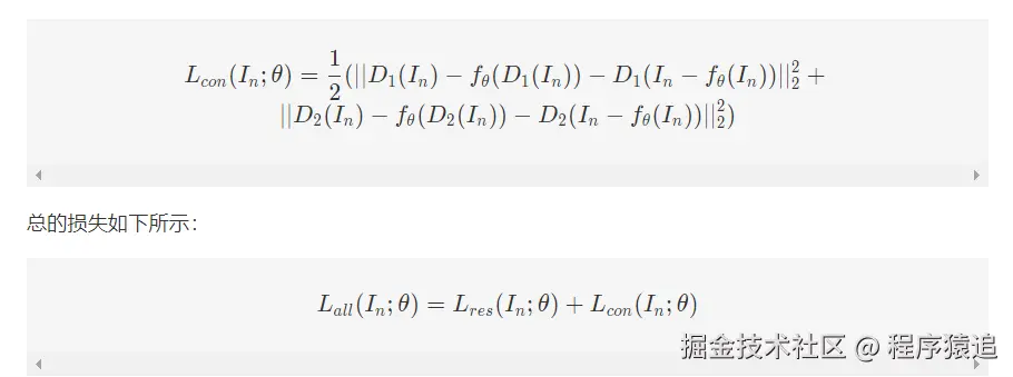 在自监督的情况下,没有干净图像作为训练目标,则可以将两张噪声图像子图互为训练目标,即噪声到噪声损失: