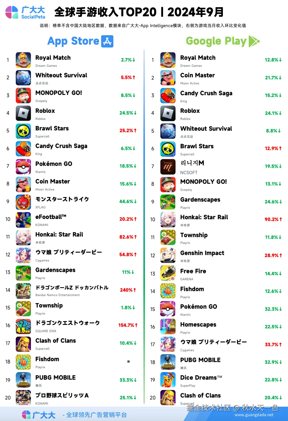 2024年9月全球手游收入TOP20榜单