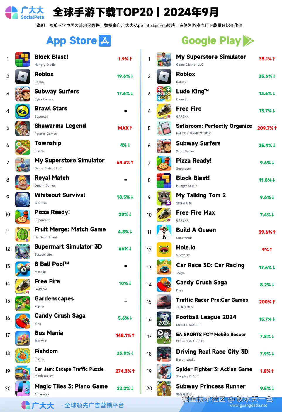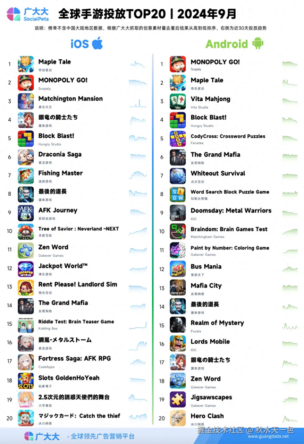 2024年9月全球手游投放TOP20榜单