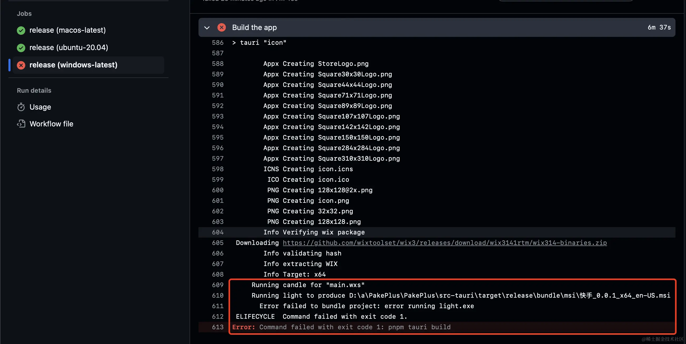 在 Tauri 使用 GitHub Actions 打包 Windows MSI 时,如果遇到 error running light.exe 的错误,特别是在打包路径中包含非 ASCII 字符(如中文字符 抖音)时,问题可能与 WiX Toolset 不支持文件路径中的非 ASCII 字符有关。