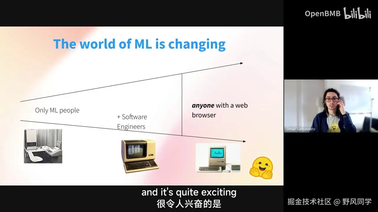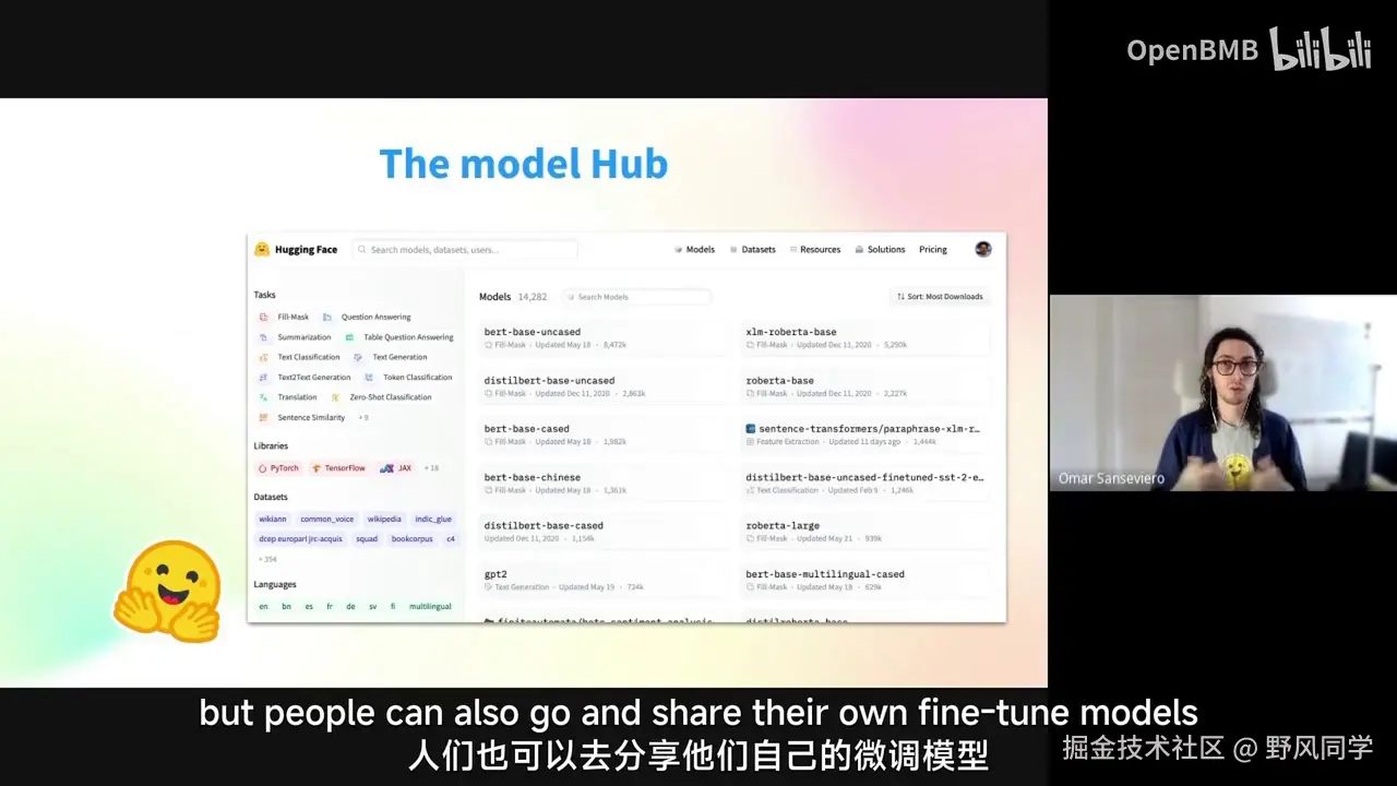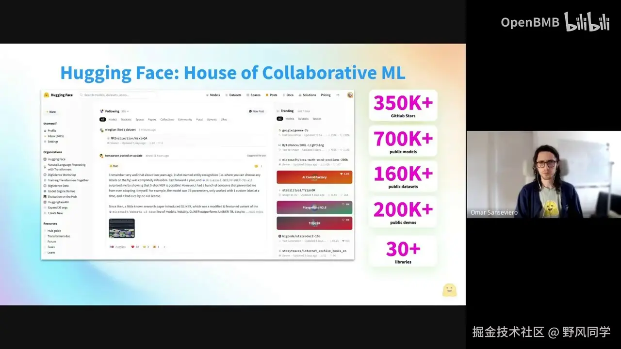 在机器学习领域,大型语言模型(LLM)空间一直非常活跃。这一系列活动的核心是Hugging Face。Hugging Face是一个开放平台,促进了机器学习的协作。在Hugging Face中,你可以访问众多模型、数据集和演示。这三者是Hugging Face的主要组成部分。目前,你可以找到超过70万个公共模型,实际上这个数字可能更高。昨天我查看了一些指标,今天我们平均每天新增5000个仓库,这对生态系统来说相当惊人。同样,你可以在浏览器中找到数据集和演示来直接测试模型。你可以按任务进行筛选,例如,如果你需要一个用于文本分类、西班牙语语音识别或图像生成的模型,你可以找到适合你特定用例的模型。此外,Hugging Face深度参与开源,它不仅是一个平台,还托管了许多开源库。你可能已经熟悉了Transformers,还有Transformers、数据集等等。