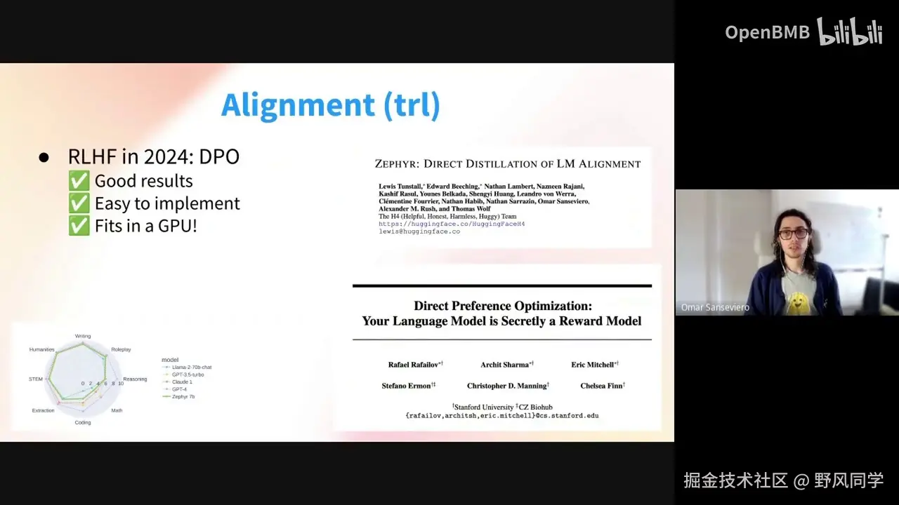 为了确保模型具备充分的对话能力,自去年以来,RLHF领域已经进行了大量研究。诸如IPO、KTO和DPO等技术消除了对预训练模型的依赖。这些方法易于实施,所需计算资源极少,并且已有开源实现可供使用。TRL库是一个开源工具,利用这些技术促进RLHF的应用。在Huggingface,我们开发了一本对齐手册,汇集了针对常见应用场景实施RLHF和对齐的方案。去年发布的Sefir项目包含一套工具包,用户只需编写脚本就能轻松复现模型。数据和模型均已公开。