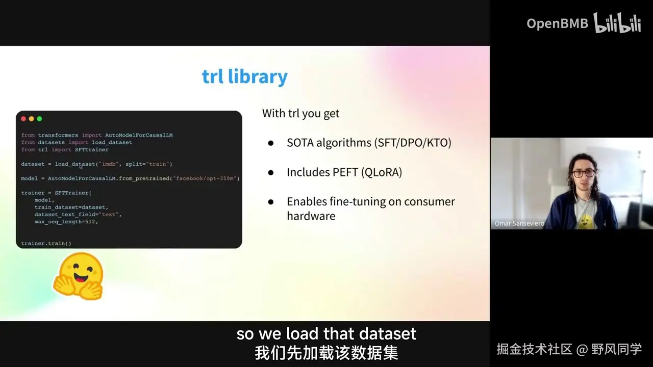 以下是使用TRL的一个示例。我们通过数据集库加载IMDB数据集。接着,使用transformers库加载Facebook的OPT模型。TRL提供了诸如SFTTrainer的封装器,允许你传入一个模型和一个包含文本的数据集,然后通过trainer.train启动训练。这包括了特定的技术,如LoRA和量化LoRA,使得在消费级硬件上也能进行微调。同时,它还集成了最先进的算法,如监督式微调、DPO和KTO。这是一个简化的例子,但文档本身非常直观。