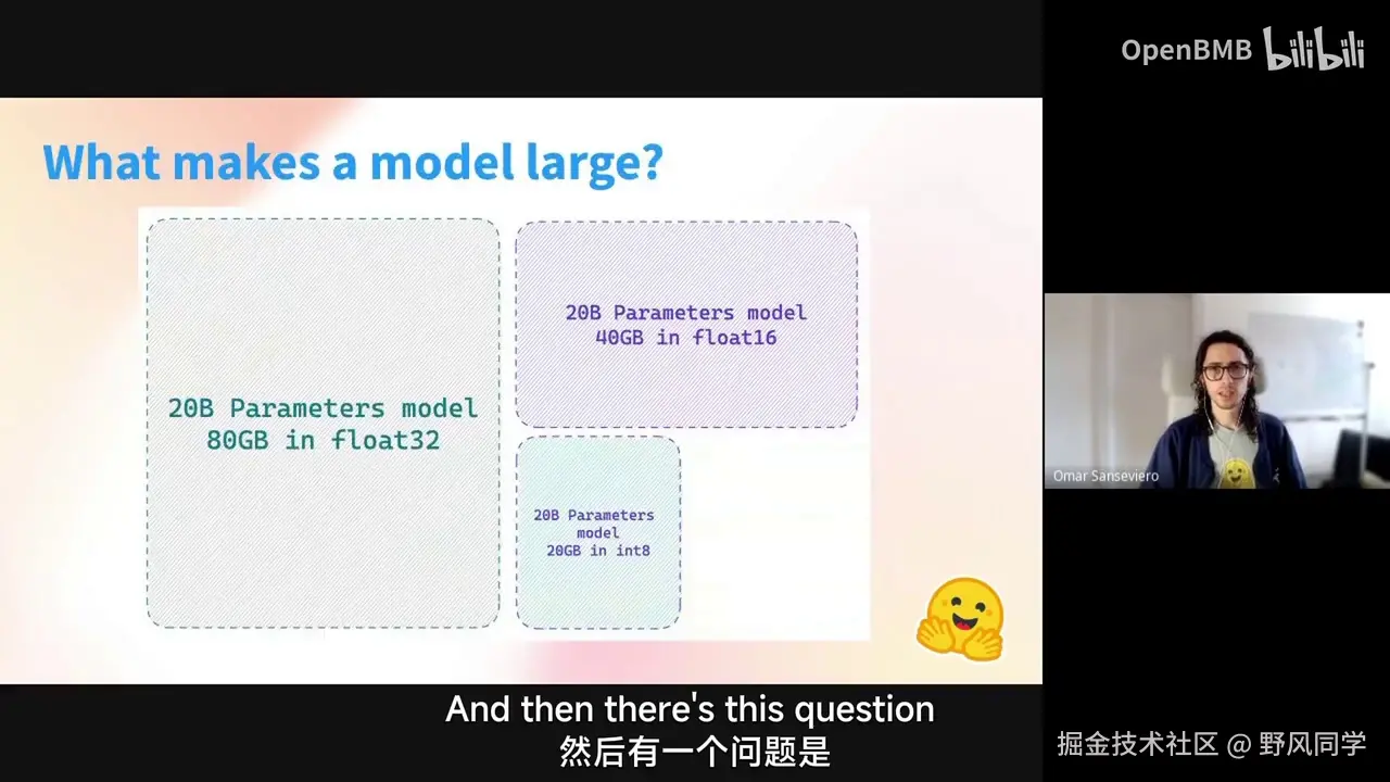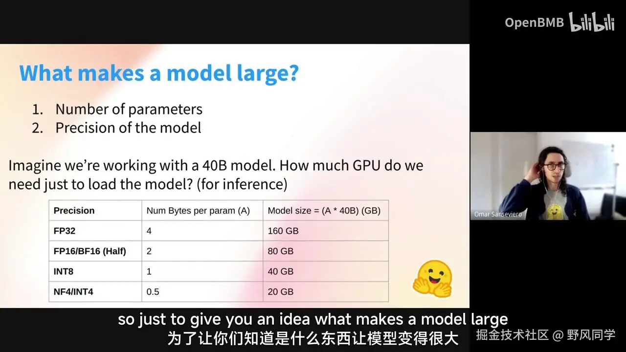 好的,再说说另一个挑战。为了让你了解为什么模型会很大,当我们谈论模型时,通常指的是参数的数量。比如说,假设你正在使用一个拥有400亿参数的模型,你可能会好奇需要多少GPU才能加载这个模型。实际上,有两个变量决定了能否加载模型。一个是参数的数量,即400亿;另一个是精度。精度指的是每个参数需要多少位。例如,如果使用FP32,这是人们训练模型时常用的精度,通常每个参数需要32位或4字节。这意味着你至少需要一块160GB的GPU才能加载这个模型。这还不是为了训练模型,仅仅是让它在你的电脑上运行。大多数人通常会以较低的精度运行模型。比如,你可以使用FP16或BF16,这样每个参数只需要2字节,从而减少了加载模型所需的GB数。然而,随着精度的降低,质量开始下降,因为网络中的信息减少了。研究表明,高达FP16的精度下,模型表现良好,允许你将精度减半而不会出现问题。通常情况下,你可以降到8位,即每个参数1字节,这仍然相当有效,尽管并非总是如此。目前有很多研究正在探索非常低的精度范围,比如每个参数1位,甚至对于专家混合模型来说,低于1位的精度也在探索之中。