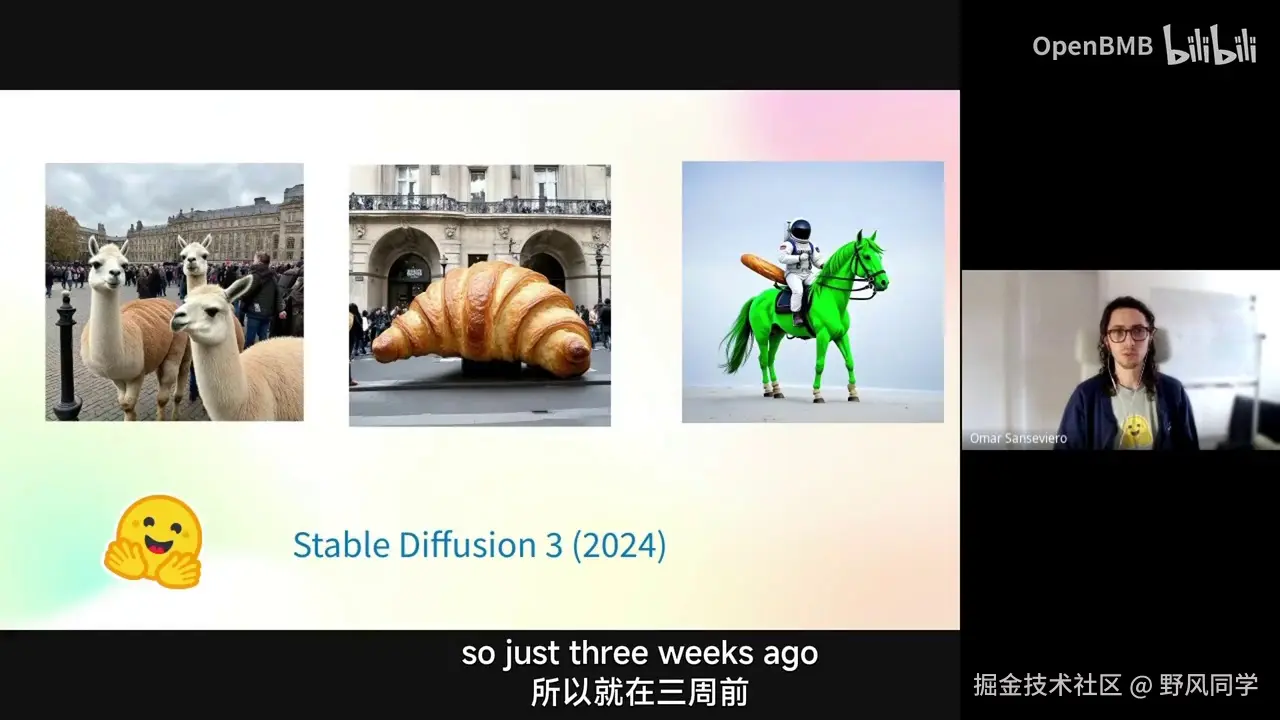 自那时起,我们取得了显著的进展。就在三周前,Stable Diffusion 3 发布了。Stable Diffusion 是一个顶尖的开源模型,能够生成图像。您在这里看到的图像,比如羊驼游览伦敦或宇航员骑着绿马手持法棍,都是完全由模型生成的。看到技术进步如此迅速,令人印象深刻且鼓舞人心。这是图像生成领域的一个例证。