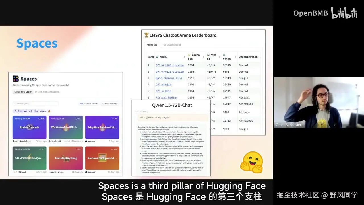 这就是Spaces的用武之地。Spaces是Hugging Face的第三大支柱。这是一个平台,人们可以在这里找到模型的开源演示和排行榜。例如,Chatbot竞技场排行榜和LLM排行榜就托管在Hugging Face Spaces上。在这里,你可以输入一个查询,比如“如何从我的后院取出LLM?”,模型就会提供输出。这一切都在浏览器中完成,无需任何设置。通过发布演示,作者可以通过这个交互系统使他们的工作更具可重复性、开放性和可访问性。