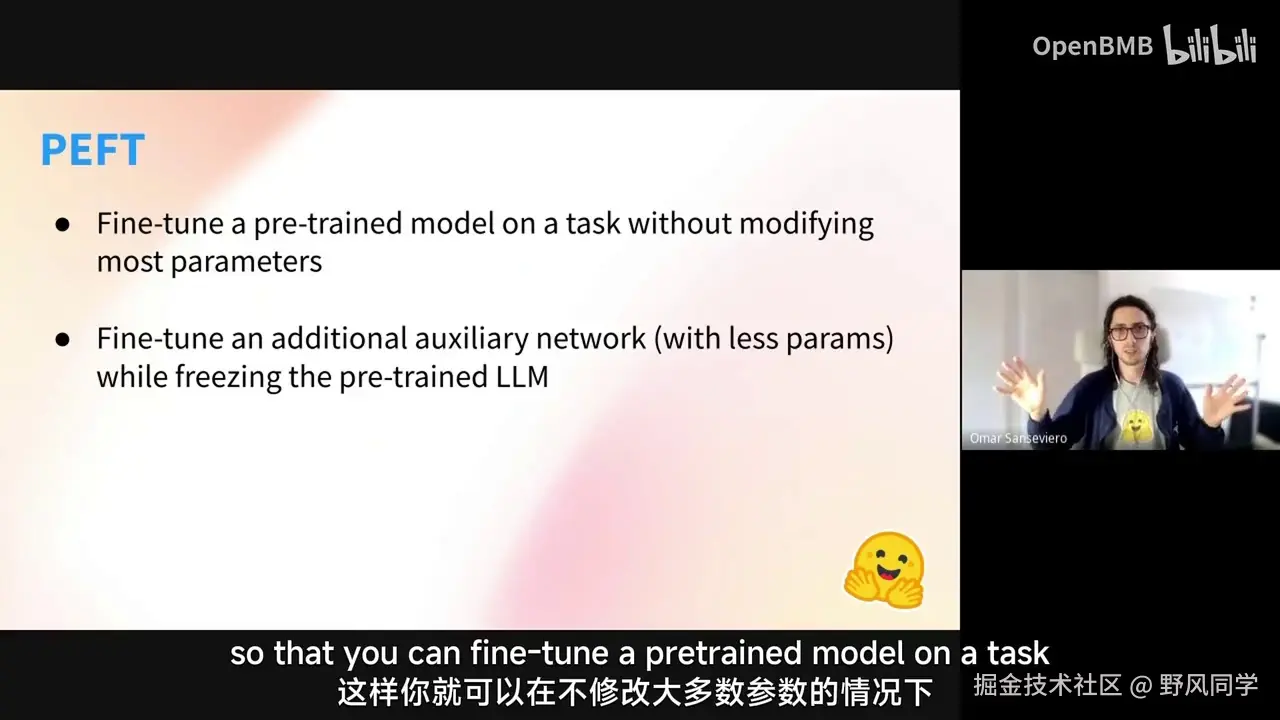 因此,PEFT的主要理念是,你可以在不改变模型大部分参数的情况下,对一个预训练模型进行任务微调。在传统意义上进行微调时,你会调整模型的所有参数。然而,使用PEFT,你可以冻结主要变换器模型,并添加一个非常小的辅助网络。在微调过程中,你只需调整辅助网络的权重。
