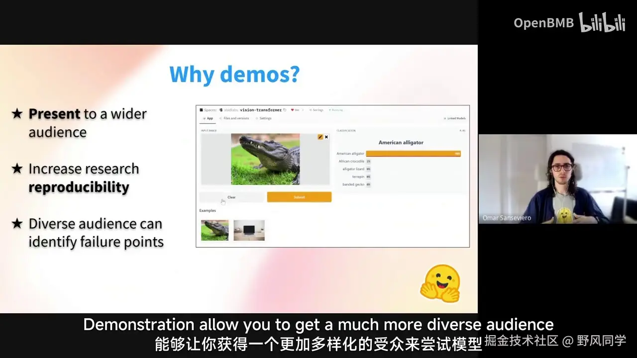 为什么演示如此有趣呢?首先,演示让你能够吸引更多样化的受众来尝试模型。如果只有机器学习专业人士测试模型,你可能会错过多样化的受众能识别的边缘案例。例如,我们与医疗生态系统中的个人,包括医生,进行了广泛的合作。通过创建并向医生展示这些演示,我们促进了他们对模型能力的理解。传统的论文往往展示精心挑选的结果,看似令人印象深刻但缺乏可重复性。而演示则允许用户输入相同的数据并直接观察模型的表现。当一个新的大型语言模型(LLM)发布时,设置一个演示可以显著影响其可访问性,让用户测试模型的有效性。没有演示,用户必须下载模型,学习如何运行推理,并适当配置他们的硬件,这更具挑战性且不够用户友好。