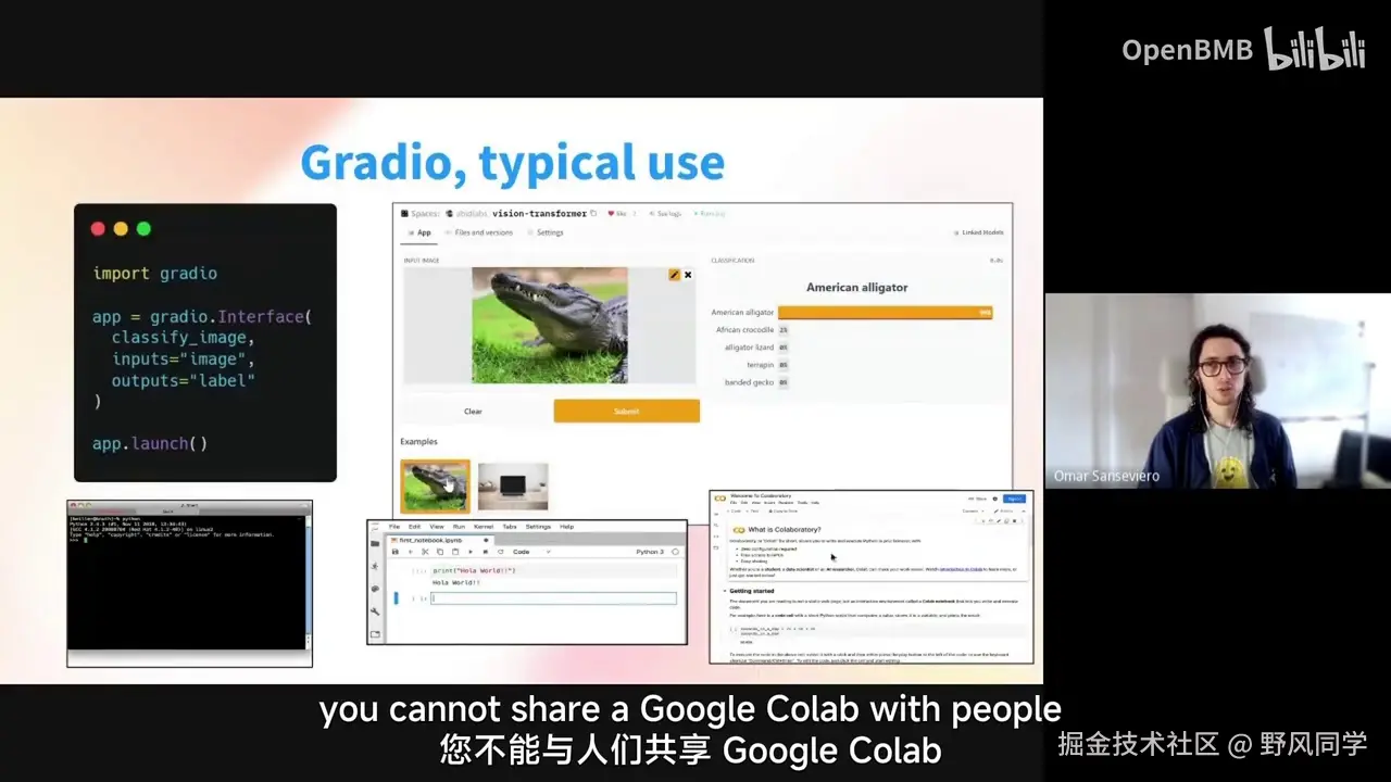 这段代码完全是用Python编写的。下面是一个极简的Gradio示例。GradioFast包含三个部分:一个输入组件、一个输出组件和一个分类函数。输入可以是图像,输出可以是图像、文本或任何其他格式。GradioFast支持多种模态,包括音频和其他多种类型。第三个部分是分类函数,它可以是任何Python代码,比如scikit-learn或自定义的研究代码库。这个函数以图像为输入,输出一个标签。你可以在多种环境中运行这个函数,包括本地bash终端、Jupyter Notebook或其他任何环境。设置起来非常简单。然而,你无法与不熟悉技术的人共享Google Colab。