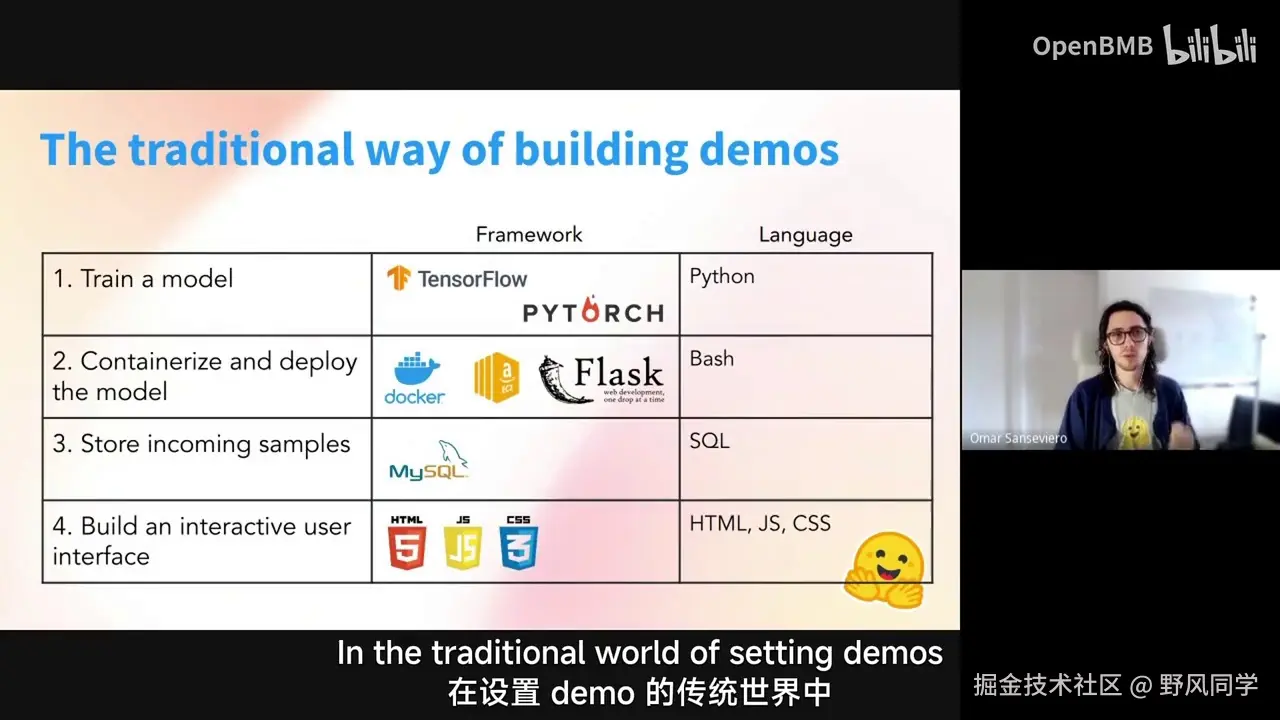 在传统的演示设置流程中,你需要先用你的工具训练模型,然后例如通过Docker构建一个容器,接着决定如何存储示例,最后用HTML、JavaScript和CSS构建一个界面。如今,分析工作会使用多种语言进行,比如Python、Bash、SQL、HTML、JavaScript和CSS。然而,现在我们有了长足的进步,开放工具如Gradio或Streamlit让你能够轻松完成所有这些任务。