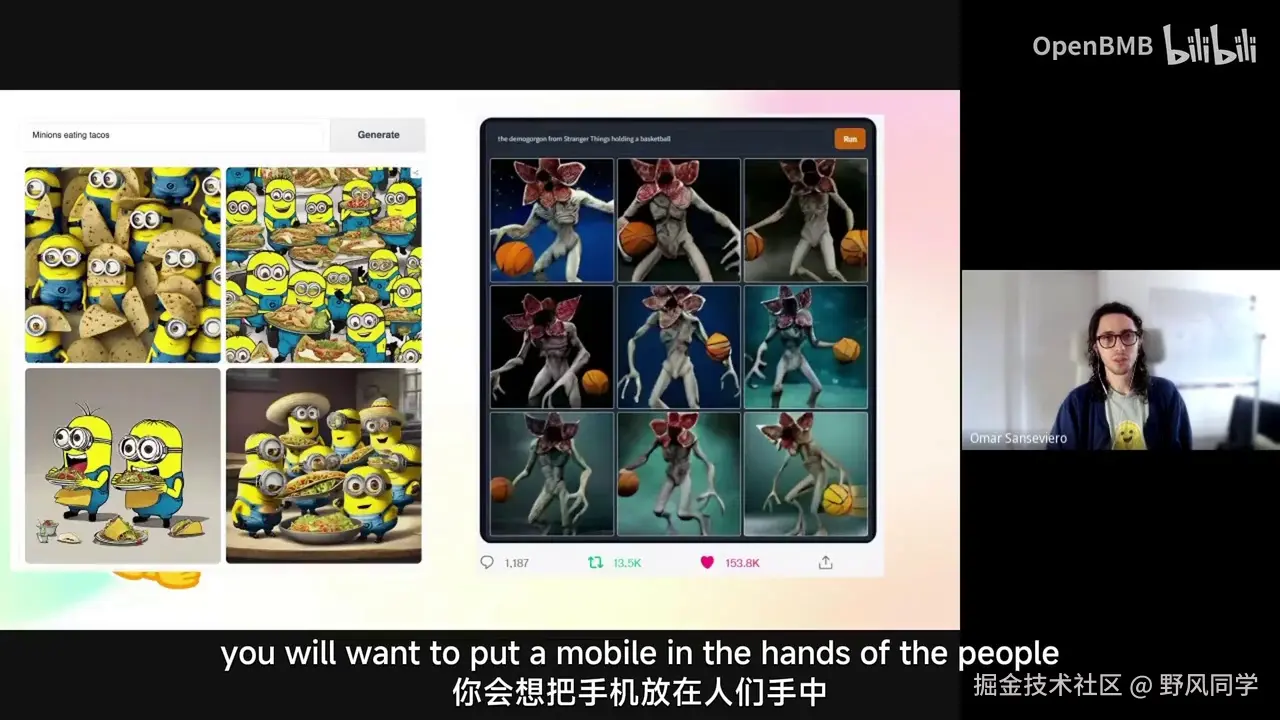 研究工作的下一步通常是将原型公之于众。起初,我分享了这样的截图:小黄人吃塔可,或是《怪奇物语》中的魔狗拿着篮子。这些都是用户可以输入文字来生成图像的界面,或者在大语言模型的情况下,想象一下像ChatGPT那样的界面,你可以在其中书写文本。