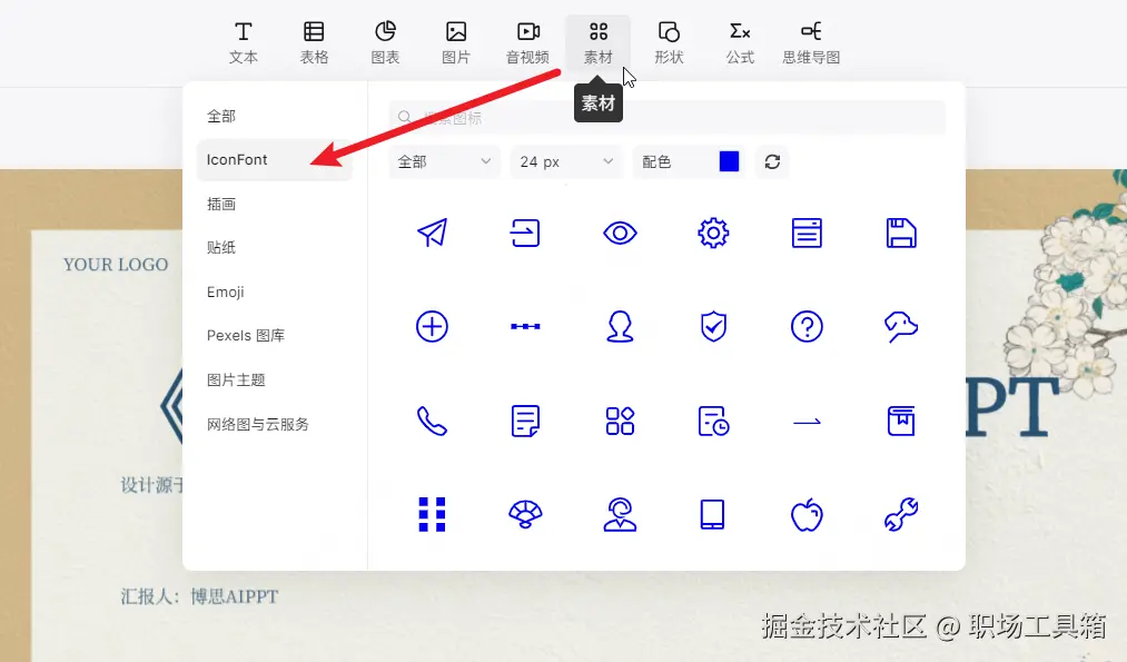 接着,打开生成的 PPT,点击顶部工具栏的素材 > IconFont,就能打开博思AIPPT内置的图标库。在这个图标库中,用户可以浏览所有的矢量图标资源,单击任意一个图标,即可快速添加到PPT页面上。