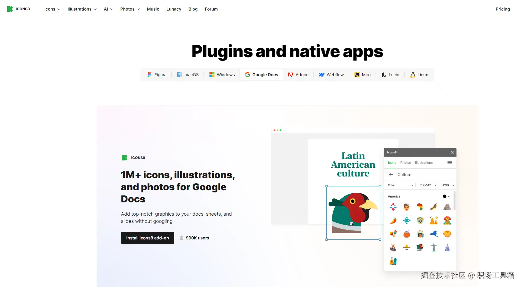 值得一提的是,Icons8还推出了适配不同应用的插件,譬如Figma插件、Google Docs插件、Adobe Photoshop插件、Adobe Illustrator长时间、Miro插件等,有了这些插件,可以在应用中直接调用Icons8的素材资源,免去中间繁琐的环节。
