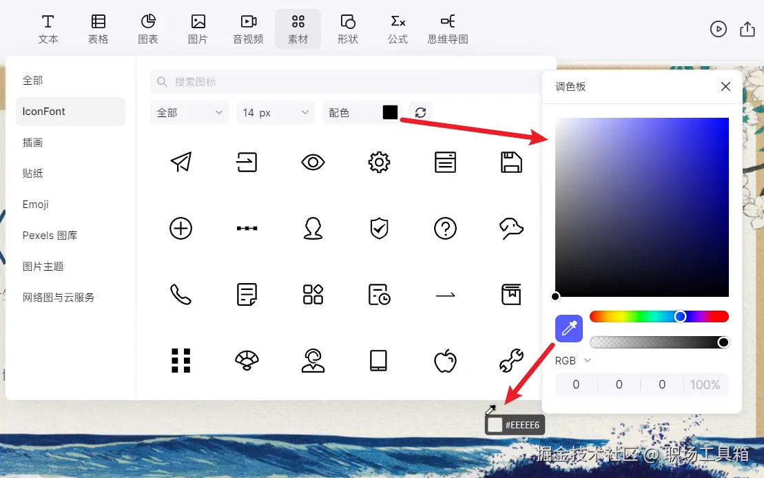 如果用户想要更改PPT小图标的颜色,也非常简单:只需点击面板的颜色缩略图,打开调色板,就可以自行选取喜欢的颜色,一键更改所有图标库的颜色。调色板下方还带有拾色器功能,可从当前页面上吸取任意颜色,这种便捷的操作方式,让用户在制作PPT的过程中能够轻松地运用各种图标,提升PPT的质量和视觉效果。