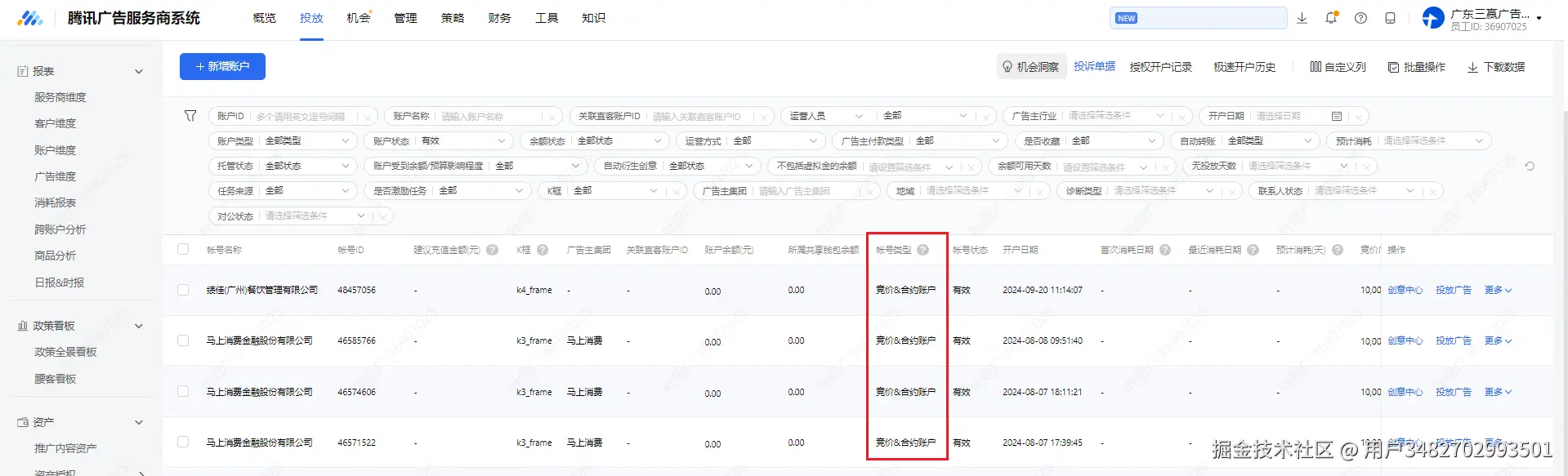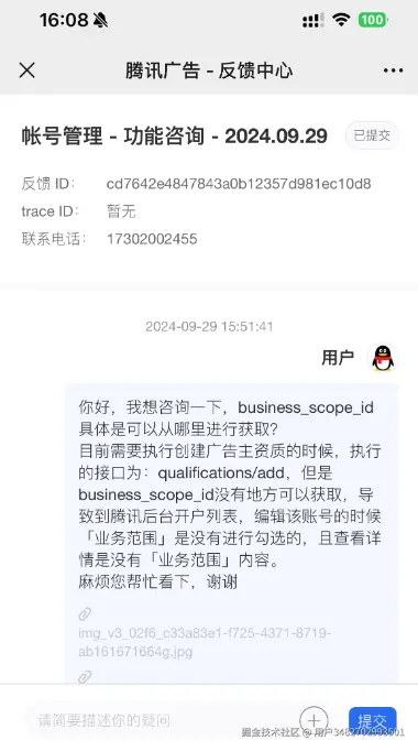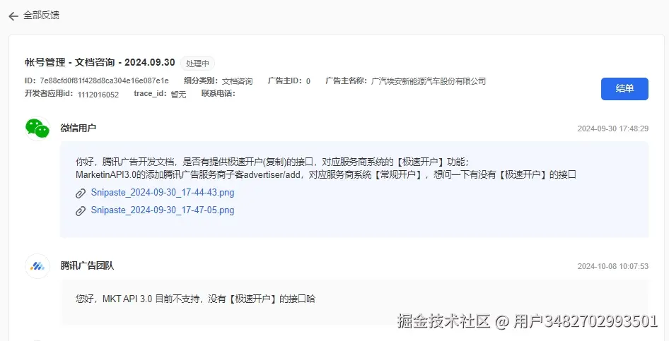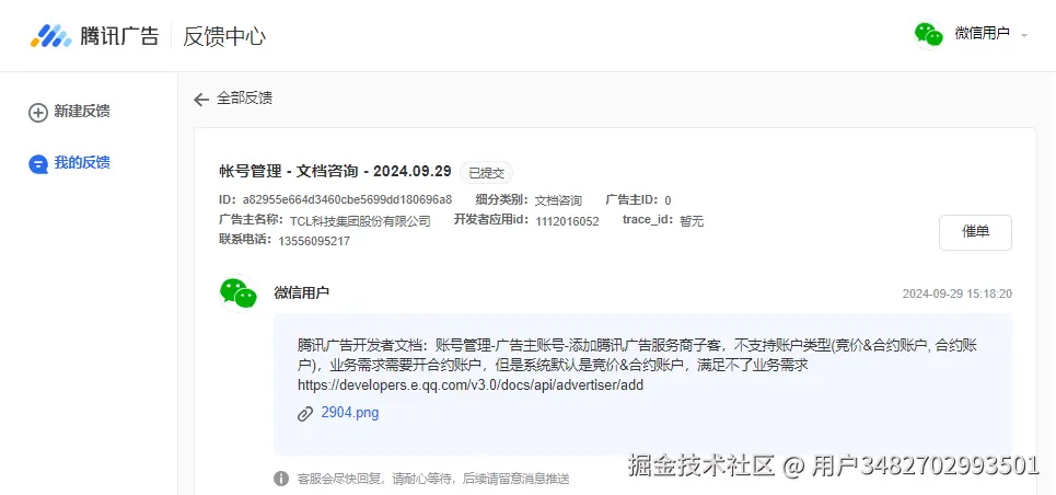 - 问题描述:腾讯广告开发者文档:账号管理-广告主账号-添加腾讯广告服务商子客,不支持账户类型(竞价&合约账户, 合约账户),业务需求需要开合约账户,但是系统默认是竞价&合约账户,满足不了业务需求 developers.e.qq.com/v3.0/docs/a… 提出时间:2024-09-29 14:30:00 工单截图:
