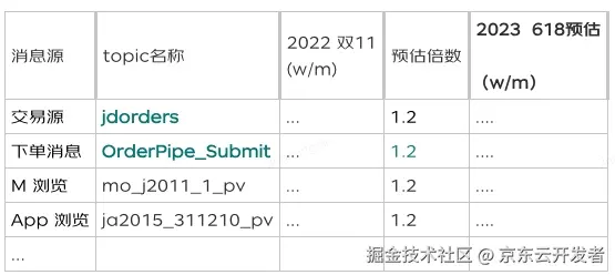 | 平台 | 数据类型 | topic名称 | 2022 双11 (w/m) | 预估倍数 | 2023 618预估(w/m) | 预估倍数 | 1.5倍预估峰值 |