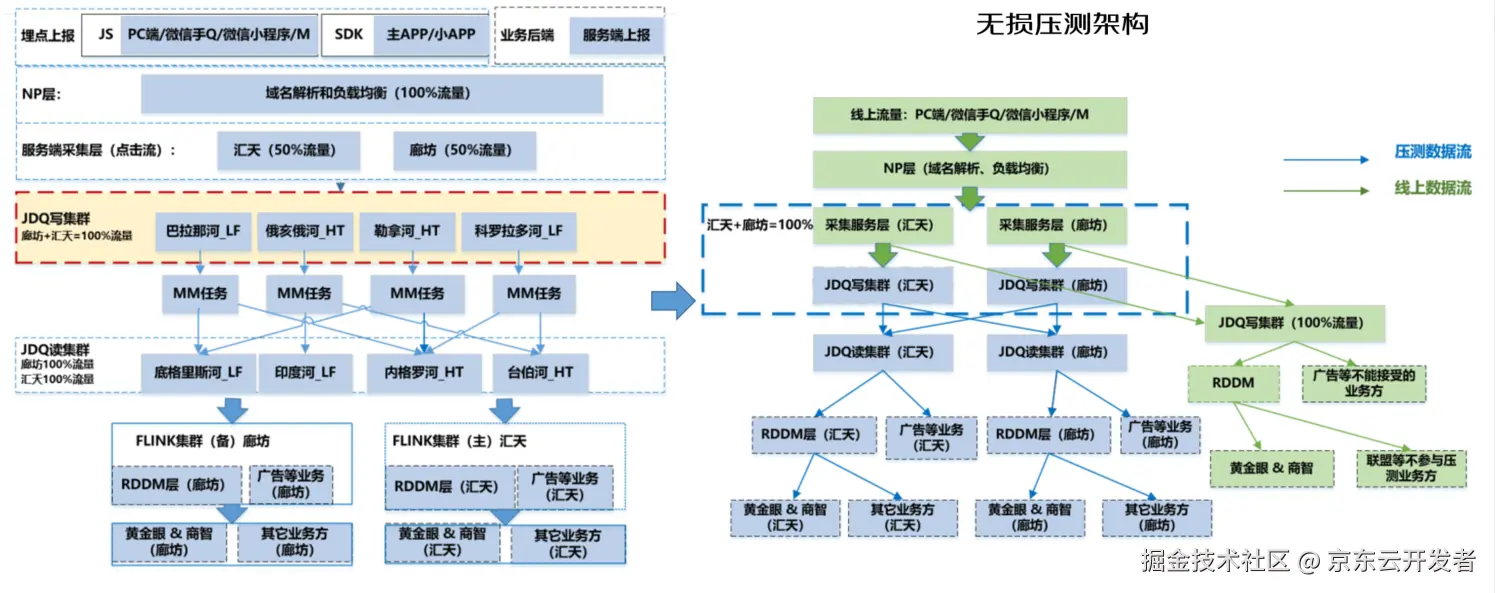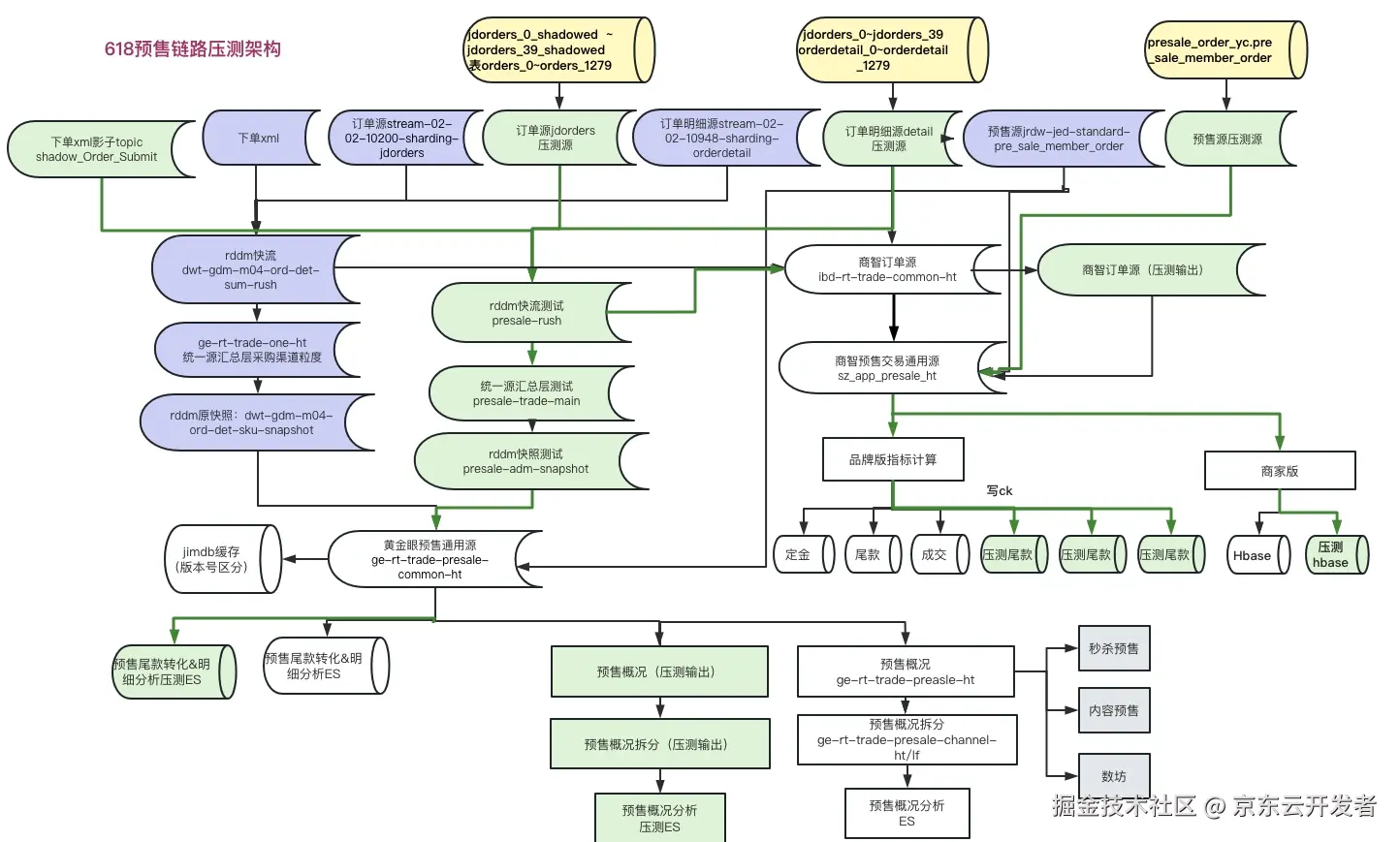 如下图所示: 黄色部分为在线军演提供数据的对应存储——影子库表 。绿色部分为压测新增,最上层为压测数据源(JMQ/JDQ) ,下面是为了压测搭建的透传压测环境以及写影子存储。黄金眼预售通用源和商智预售交易通用源对应任务改成双进双出,同时可以处理线上数据源和压测数据源,线上数据写入线上输出topic和线上存储。 压测数据源的数据处理后输出压测数据的topic,写入影子存储。这样线上拓扑不用随着每次压测改动,同时,下游业务方也可以灵活选择是否参与压测。