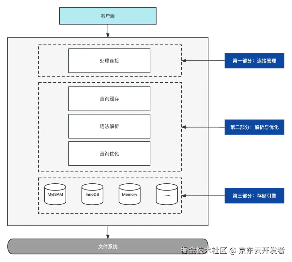 我们重点关注第二部分和第三部分,第二部分其实就是Server层,这层主要就是负责查询优化,制定出一些执行计划,然后调用存储引擎给我们提供的各种底层基础API,最终将数据返回给客户端。