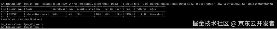 select count(1) from jdhe_medical_record where status = 1 and is_test = #{isTest,jdbcType=INTEGER} and electric_medical_record_status in (2,3) and patient_id = #{patientId,jdbcType=BIGINT} and doctor_pin = #{doctorPin,jdbcType=VARCHAR} and created >#{dateStart,jdbcType=TIMESTAMP};当时的索引情况