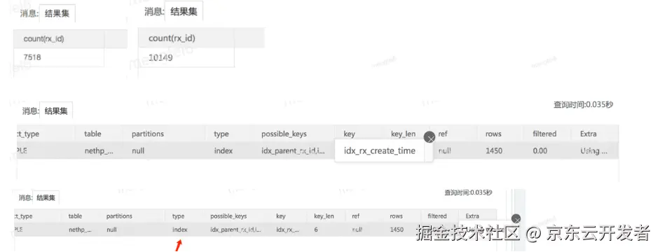 1、没加新索引rx_create_time的时候,由于order by后边没有索引,就看where条件中是否有合适的索引,查询选择器选定rx_status这个单列索引,而rx_status=5这个条件下限制的数据行在索引中是连续,即使需要的rx_id不在索引中,再回主键聚簇索引也来得及,由于order by后边没有索引,所以走磁盘级别的排序filesort,高峰积压的时候处方就1万到2万,跑到了100ms,白天低谷的时候几百单也就20ms。