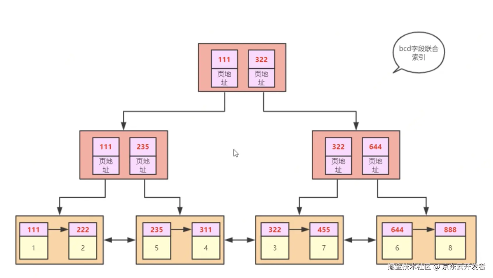 但是我们也不一定每次都按照主键来执行SQL语句,大部分情况下都是按照一些业务字段来,那就会形成别的索引树,例如,如果按照b,c,d来创建的索引就会长这样。