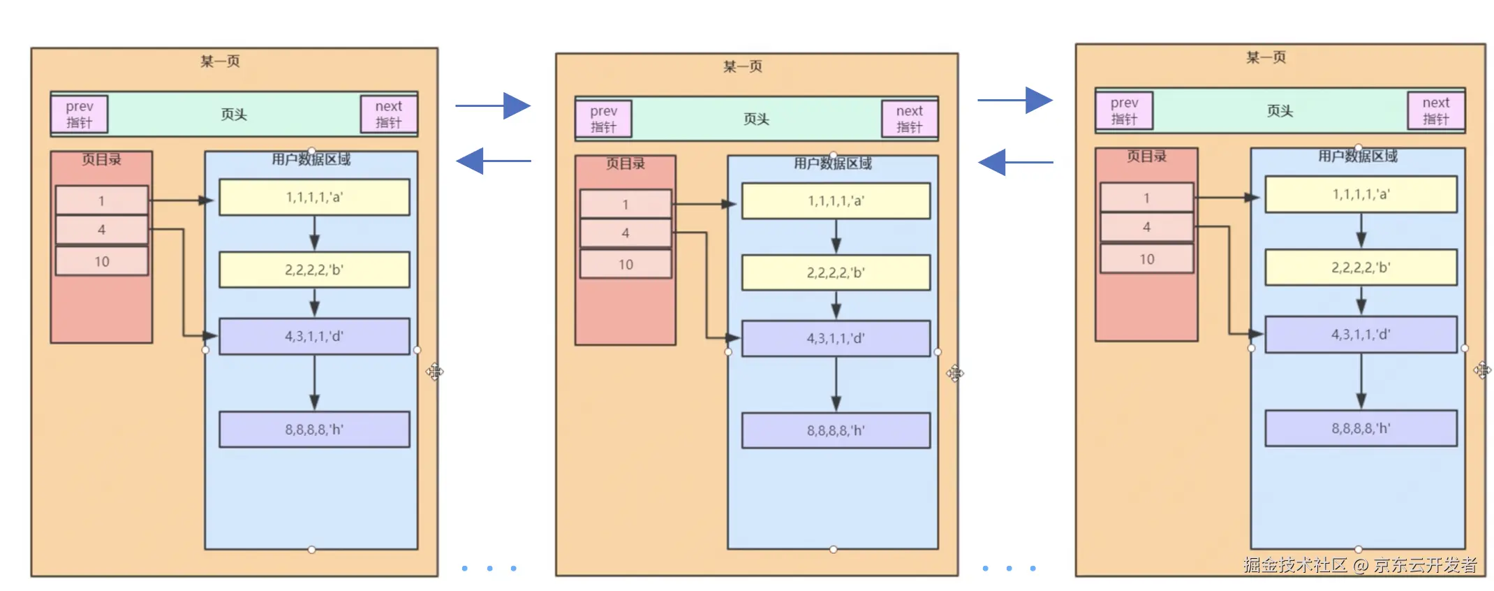 页内的单向链表是为了查找快捷,而页间的双向链表是为了在做范围查询的时候提效,下图为示意图,其中其二页和第三页是复制的第一页,并不真实。